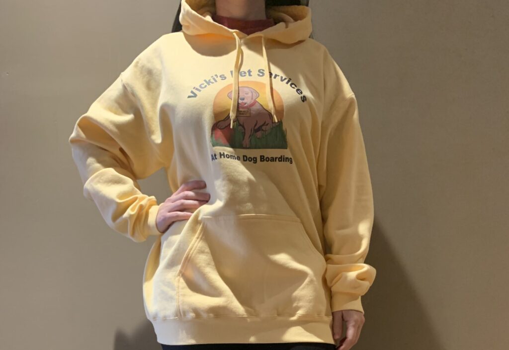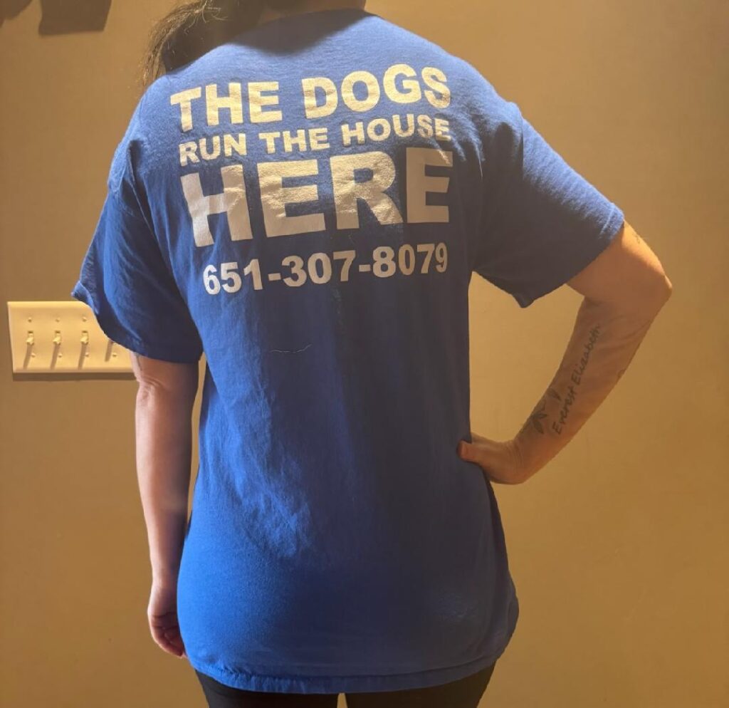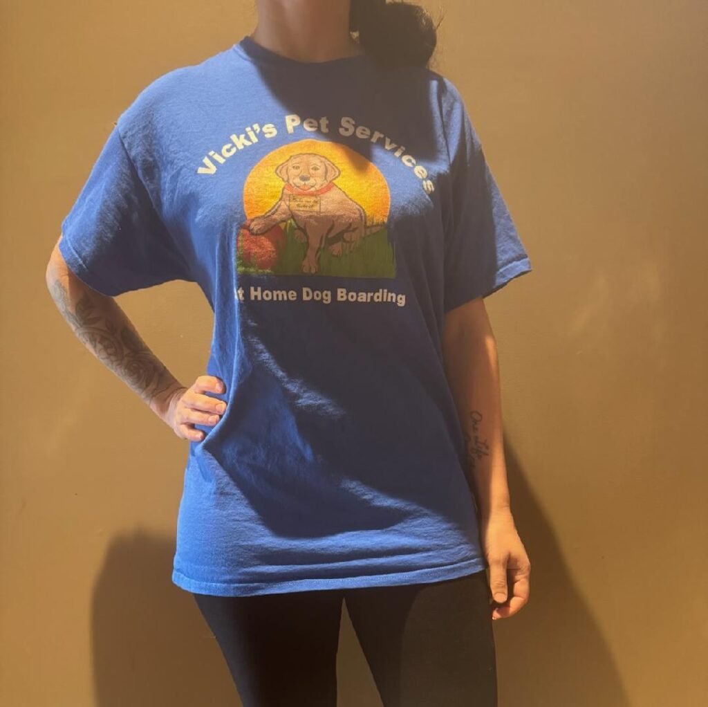 Show off your love for dogs with Vicki’s Pet Services super-soft comfort-fit T-shirt! The front features a cheerful vintage-style happy puppy holding a ball against a golden sun with “Vicki’s Pet Services – At Home Dog Boarding” proudly displayed, while the back declares in huge bold letters: “THE DOGS RUN THE HOUSE HERE.” Perfect for every proud dog parent, this unisex cotton-blend tee is just $15 and comes in Red, Blue, Green, Sand, Army Green, plus eye-catching Neon Orange, Neon Yellow, and Neon Green. Sizes M–XL – grab yours and let the world know who really runs the house! 🐶🐾